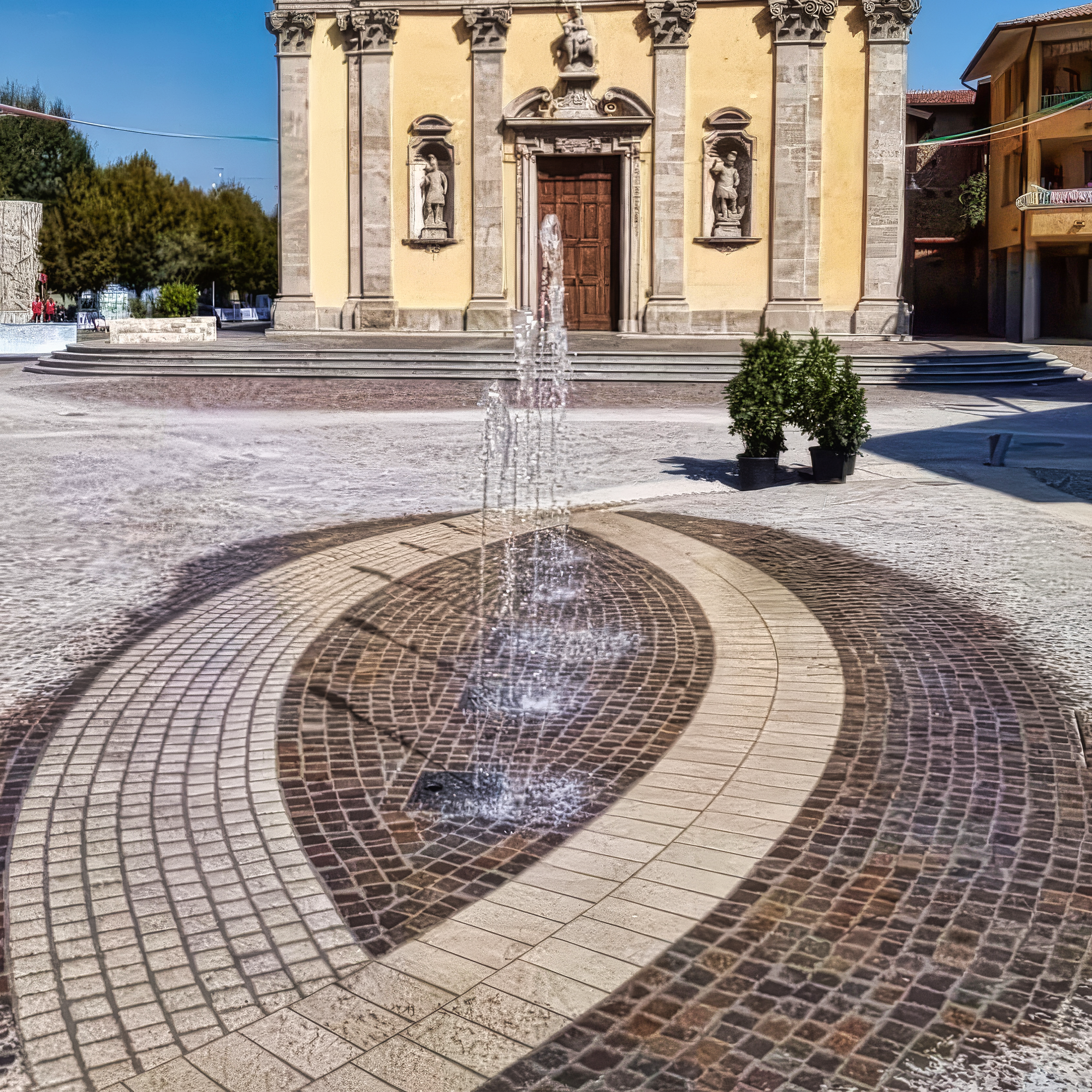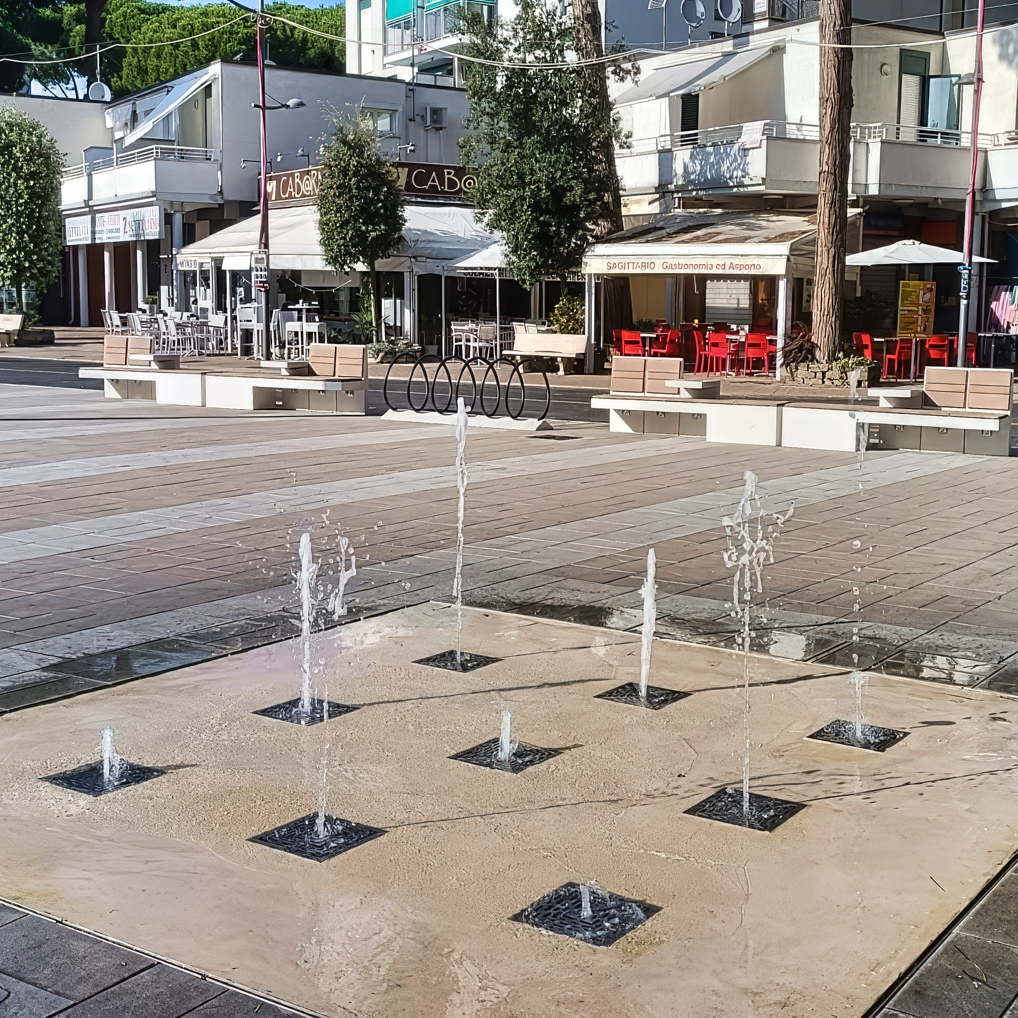 Thanks to the positioning of the components at ground level, there is a definite scenic effect, while maintaining any pedestrian or driveway space. We would therefore have this dual functionality of use with the possibility of switching on the games during programmed periods, leaving the urban space unaltered when the system is switched off, perhaps in colder periods. The water games that can be used are of the most varied and each will create different scenic effects.